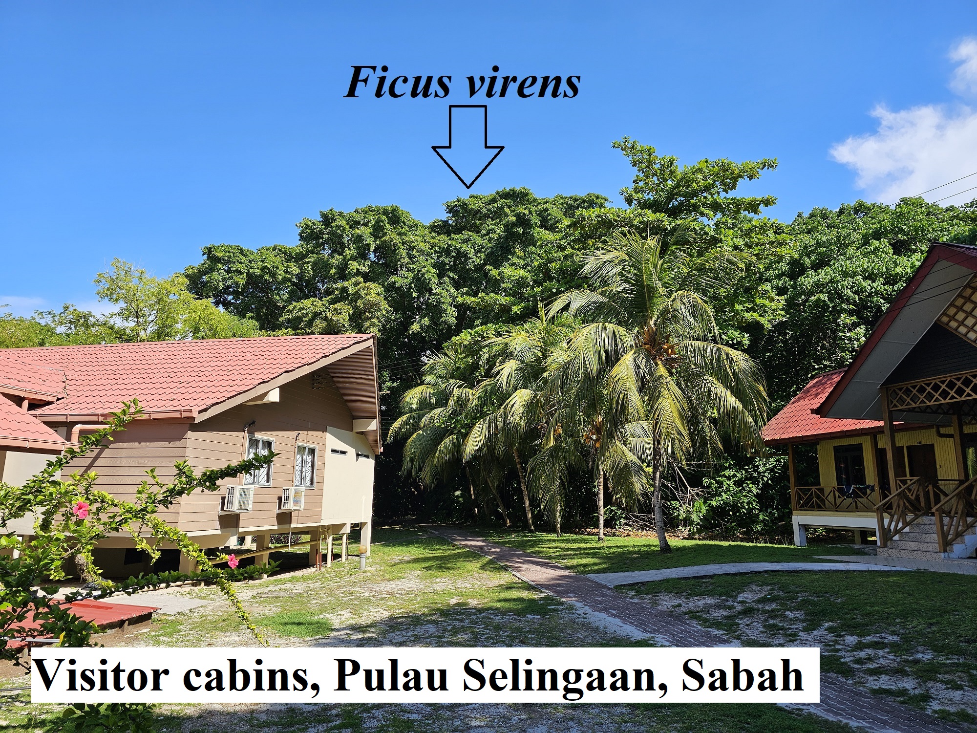 We found that the island vegetation was dominated by numerous very large fig trees including Ficus microcarpa (most common), Ficus virens (at least two large trees and probably several more smaller trees), and Ficus drupacea (at least one large tree). Both the Ficus drupacea and the largest Ficus virens were fruiting during our visit. We only saw Glossy Starlings and Yellow-vented Bulbuls feeding in the canopy. However, Megapodes were common and seen feeding on the fallen figs..