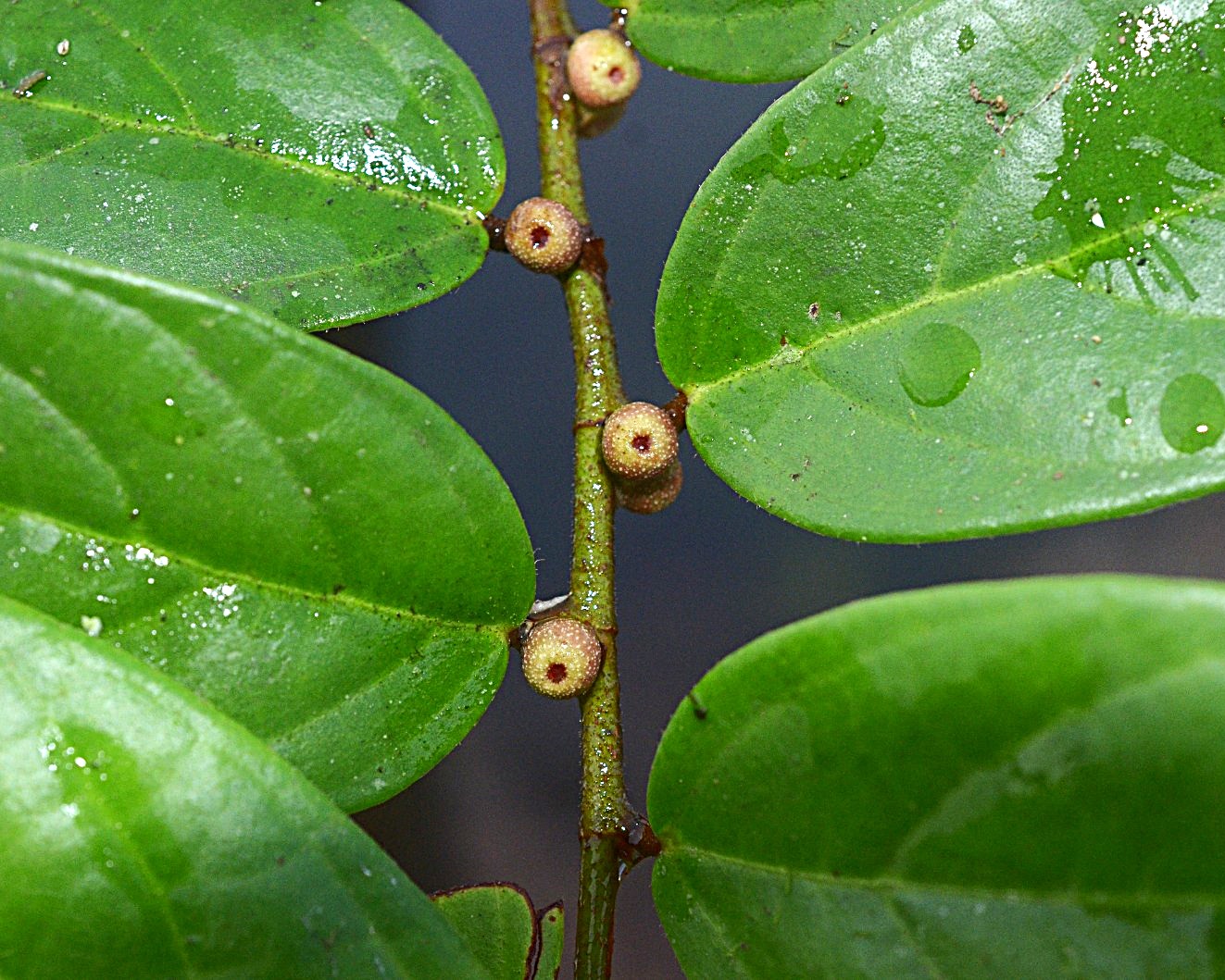A comparison of the undersurface of leaves of both species is shown below. Note that only the two Ficus villosa leaves are labelled below not the Ficus supperforata leaves. A foveolate surface is patterned with tiny depressions. Many root climbing figs in Borneo have leaves with a foveolate undersurface. In contrast the undersurface of Ficus villosa leaves are patterned with tiny white dots.
